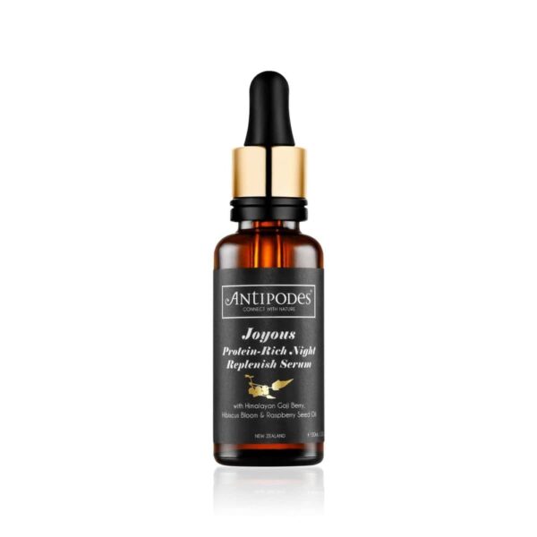 Visit Joyous Rich Protein-Enriched Plumping Night Serum of the brand Antipodes is primarily intended for skin in need of nighttime regeneration, intense nourishment, and prevention of skin aging. Its formulation targets loss of firmness, dryness, and the appearance of early wrinkles. My analysis highlights a holistic approach, favoring natural active ingredients rich in antioxidants and essential fatty acids, suitable for mature, dry, or devitalized skin.