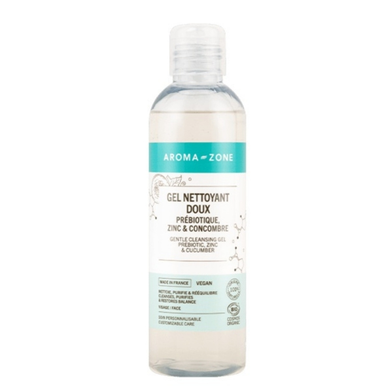 AQUA, GLYCERIN, PENTYLENE GLYCOL, ERYTHRITOL, INULIN (Prebiotic), DISODIUM COCOYL GLUTAMATE (Anionic surfactant), CUCUMIS SATIVUS FRUIT EXTRACT (Cucumber), ZINC PCA (Zinc), Aloe Barbadensis Leaf Juice Powder (Aloe vera), Leuconostoc/Radish Root Ferment Filtrate, DECYL GLUCOSIDE (Nonionic surfactant), XANTHAN GUM, SODIUM GLUCONATE, LEVULINIC ACID, CITRIC ACID, SODIUM LEVULINATE, SODIUM CHLORIDE Ce gel nettoyant formulé par Aroma-Zone associe plusieurs actifs fonctionnels pour un nettoyage doux adapté aux peaux sensibles et mixtes. L’inuline et le pentylène glycol agissent comme agents prébiotiques et hydratants, soutenant l’équilibre du microbiome cutané tout en limitant la déshydratation lors du rinçage. Le zinc PCA régule la sécrétion sébacée et présente des propriétés antibactériennes légères, ce qui le rend pertinent pour les peaux à tendance grasse ou sujettes aux imperfections. L’extrait de concombre (*Cucumis sativus*) apporte des propriétés apaisantes et rafraîchissantes, tandis que le jus d’aloe vera en poudre contribue au confort cutané post-nettoyage. Le filtrat fermenté de radis noir (*Leuconostoc/Radish Root Ferment Filtrate*) joue un rôle de conservateur naturel avec une activité antimicrobienne. Les tensioactifs utilisés — disodium cocoyl glutamate et decyl glucoside — sont d’origine végétale et reconnus pour leur douceur sur la barrière cutanée. L’érythritol complète l’action hydratante. Ce produit convient particulièrement aux peaux normales à mixtes, sensibles ou réactives, ainsi qu’aux personnes recherchant une formulation sans conservateurs synthétiques classiques.