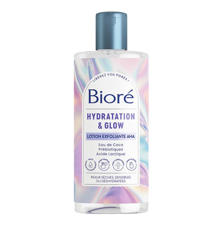AQUA, GLYCERIN, BUTYLENE GLYCOL, ETHOXYDIGLYCOL, LACTIC ACID (AHA exfoliating acid), MANNITOL (Sugar), INULIN (Prebiotic), MALIC ACID (AHA exfoliating acid), SODIUM HYDROXIDE, PANTHENOL (Pro-vitamin B5), Tetrasodium glutamate diacetate, COCOS NUCIFERA WATER (Coco), Leuconostoc/Radish Root Ferment Filtrate, SODIUM BENZOATE Cette lotion exfoliante de Bioré associe deux acides de fruits (AHA) aux mécanismes d’action complémentaires : l’acide lactique (AHA dérivé de la fermentation) et l’acide malique, qui agissent en dissolvant les liaisons entre les cornéocytes pour favoriser le renouvellement cellulaire et affiner le grain de peau. La glycérine et le panthénol (provitamine B5) assurent une hydratation compensatoire, limitant l’effet desséchant potentiel des acides. L’inuline et le mannitol, deux polyols d’origine végétale, renforcent la rétention d’eau dans les couches superficielles de l’épiderme. L’eau de coco (*Cocos nucifera water*) apporte des minéraux et électrolytes, tandis que le filtrat de fermentation de radis noir (*Leuconostoc/Radish Root Ferment Filtrate*) joue un rôle de conservateur naturel aux propriétés antimicrobiennes douces. Ce produit convient aux peaux ternes, à texture irrégulière ou légèrement congestionnée, souhaitant un exfoliant chimique doux utilisable en routine régulière. Les peaux sensibles ou réactives devront procéder à un test de tolérance préalable, les AHA pouvant induire une légère irritation ou photosensibilisation.