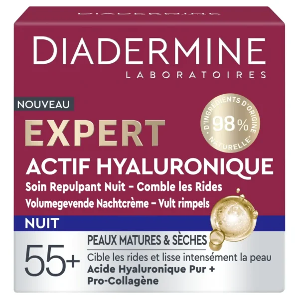 Care Diadermine Expert Hyaluronic Active 55+ – Night Aimed primarily at mature skin, particularly skin showing signs of aging such as wrinkles, loss of firmness, and dryness. The Diadermine brand offers a formula specifically designed to meet the needs of skin over 55, focusing on intense hydration and stimulating nighttime regeneration. My expert opinion is that the formulation is consistent with the target audience, thanks to the combination of moisturizing, nourishing, and anti-aging active ingredients.