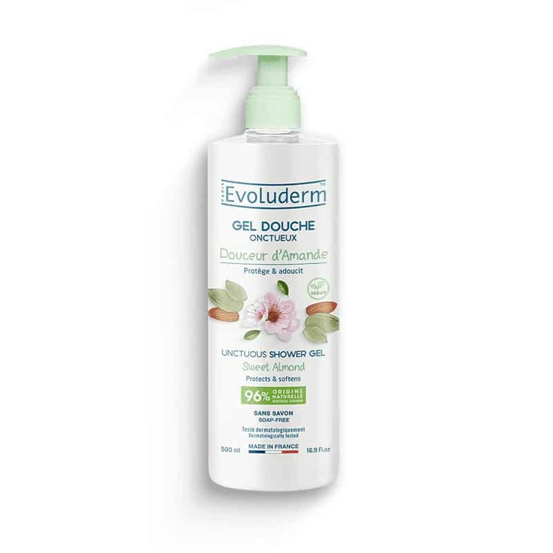 AQUA, SODIUM LAURETH SULFATE (Anionic surfactant), GLYCERIN, SODIUM CHLORIDE, BUTYROSPERMUM PARKII BUTTER EXTRACT (Shea butter), Sweet Almond Seed Extract (Sweet almond), COCAMIDOPROPYL BETAINE (Amphoteric surfactant), SODIUM BENZOATE, PERFUM (Perfume), DECYL GLUCOSIDE (Nonionic surfactant), CITRIC ACID, Styrene/acrylates copolymer, COCO-GLUCOSIDE (Nonionic surfactant), HEXYL CINNAMAL (Regulated allergen), LINALOOL (Regulated allergen), BENZOIC ACID, LAUROYL LYSINE, XANTHAN GUM, POTASSIUM SORBATE Ce gel douche nettoyant d’Evoluderm associe plusieurs agents lavants de nature et d’irritabilité différentes : le sodium laureth sulfate (SLES) constitue le tensioactif principal, adouci par la cocamidopropyl bétaïne (amphotère) et le décyl glucoside ainsi que le coco-glucoside (tous deux d’origine végétale), ce qui contribue à limiter le potentiel irritant de la formule. La glycérine, humectant classique, aide à maintenir l’hydratation cutanée pendant le rinçage. L’extrait de beurre de karité (*Butyrospermum parkii*) apporte des acides gras (oléique, stéarique) aux propriétés émollientes, tandis que l’extrait de graine d’amande douce (*Prunus amygdalus dulcis*) est riche en acides gras insaturés et en tocophérols, contribuant à l’assouplissement du film cutané. La lauroyl lysine, acide aminé acylé, améliore la texture et le glissant sur la peau. La formule est stabilisée par gomme xanthane et conservée par un système benzoate de sodium/sorbate de potassium. Ce produit convient aux peaux normales à sèches souhaitant un nettoyage doux avec un effet émollient de rinçage ; les peaux très sensibles ou réactives devront noter la présence d’allergènes parfumants déclarés (hexyl cinnamal, linalool).Informations complémentaires