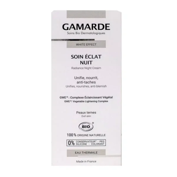 Visit Gamarde White Effect – Nighttime radiance treatment is mainly intended for people looking for a radiant effect, an even complexion, and action on pigmentation spots. The Gamarde brand offers a formula designed to correct dull complexions, prevent pigmentation irregularities, and soothe the skin, while respecting sensitive skin thanks to its natural, plant-based base. My expert opinion is that this product is part of a gentle dermo-cosmetic approach, suitable for skin prone to dullness, dehydration, or the appearance of spots.