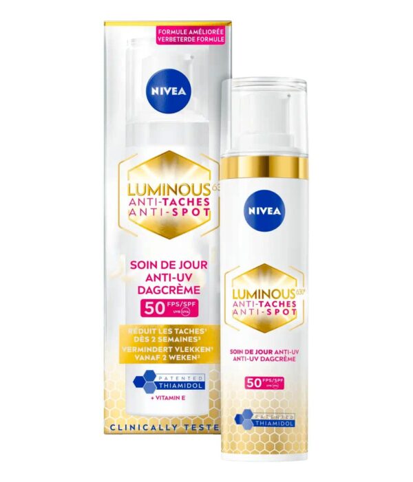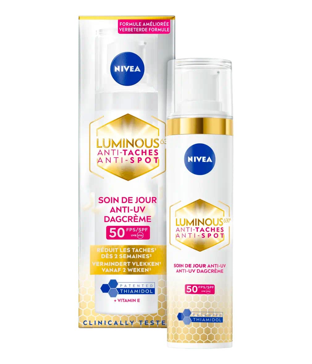 Visit Luminous 63 Anti-Dark Spot and Blemish Day Cream Nivea's product mainly targets hyperpigmentation, dark spots, and uneven skin tone. This product is intended for people who want to reduce pigmentation spots, whether they are caused by sun exposure, aging, or past blemishes. Nivea's formula stands out for its combination of depigmenting and protective active ingredients, making it a complete solution for preventing and correcting spots while protecting the skin from external aggressions.