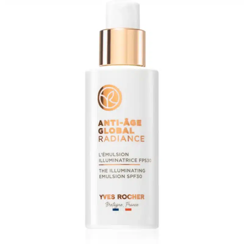 The product Global Anti-Aging Radiance Illuminating Emulsion SPF30 of the brand Yves Rocher s’adresse principalement aux peaux matures ou exposées aux premiers signes de l’âge, cherchant à prévenir et corriger les rides, le manque d’éclat et la perte de fermeté. Sa formulation vise à protéger la peau des agressions extérieures, notamment des rayons UV, tout en apportant un effet illuminateur immédiat. Mon avis d’expert est que cette émulsion s’inscrit dans une démarche globale anti-âge, combinant protection solaire et actifs végétaux pour une action préventive et correctrice.