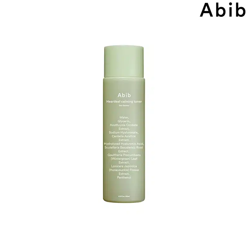AQUA, HOUTTUYNIA CORDATA EXTRACT (Poivre de Chine), GLYCERIN, BUTYLENE GLYCOL, PENTYLENE GLYCOL, XYLITOL (Sucre), BIFIDA FERMENT LYSATE, SODIUM HYALURONATE (Acide hyaluronique), GLYCINE SOJA SEED EXTRACT (Soja), CENTELLA ASIATICA EXTRACT (Centella asiatica), HYDROLYZED HYALURONIC ACID (Acide hyaluronique hydrolysé), SCUTELLARIA BAICALENSIS ROOT EXTRACT (Scutellaire baicalensis), GAULTHERIA PROCUMBENS LEAF EXTRACT (Gaulthérie couchée), LONICERA JAPONICA FLOWER EXTRACT (Chèvrefeuille du Japon), BETAINE (Sucre), 1,2-HEXANEDIOL, PANTHENOL (Pro-vitamine b5), ETHYLHEXYLGLYCERIN, OCTANEDIOL, TOCOPHEROL (Vitamine E), BIOSACCHARIDE GUM-4, DISODIUM EDTA, XANTHAN GUM Le **Heartleaf Calming Toner** d’Abib est une lotion apaisante formulée autour de l’extrait de *Houttuynia cordata* (heartleaf), une plante reconnue pour ses propriétés anti-inflammatoires et antibactériennes, particulièrement adaptée aux peaux réactives, sujettes aux rougeurs ou à l’acné. L’association d’acide hyaluronique sous deux formes moléculaires (sodium hyaluronate et acide hyaluronique hydrolysé) assure une hydratation en profondeur et en surface. Le *Bifida Ferment Lysate*, lysat de ferment probiotique, contribue au renforcement de la barrière cutanée et à l’équilibre du microbiome. Les extraits de *Centella asiatica* et de *Scutellaria baicalensis* apportent une action apaisante et antioxydante complémentaire, tandis que le panthénol soutient la réparation tissulaire. Le xylitol et la glycérine complètent le profil humectant de la formule. Ce produit convient particulièrement aux peaux sensibles, irritées ou à tendance acnéique, et peut s’intégrer dans une routine quotidienne matin et soir, appliqué après le nettoyage en première étape de soin.