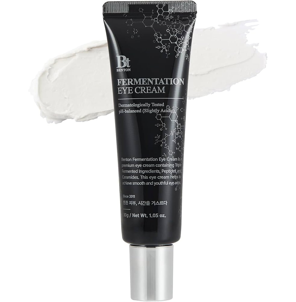 La **Benton Fermentation Eye Cream** est une crème contour des yeux formulée autour d’un complexe fermenté dense : le **Galactomyces Ferment Filtrate** (issu de la fermentation de levures) et le **Bifida Ferment Lysate** améliorent la texture cutanée et renforcent la barrière, tandis que le **Lactobacillus/Collagen Ferment Filtrate** soutient la cohésion du tissu conjonctif. La formule intègre plusieurs peptides bioactifs — **Copper Tripeptide-1, Palmitoyl Pentapeptide-4 (Matrixyl), Palmitoyl Tripeptide-1, Hexapeptide-9 et -11** — qui stimulent la synthèse de collagène et contribuent à atténuer les rides d’expression. Le **Ceramide NP** et le **Sodium Hyaluronate** assurent hydratation et renforcement de la barrière lipidique, pendant que le **Beta-Glucan** et l’**Adénosine** exercent une action apaisante et anti-âge complémentaire. Le **Panthenol** et l’**Allantoïne** participent à la tolérance cutanée. La texture émolliente, enrichie en huile de macadamia et triglycérides, convient particulièrement aux peaux sèches à normales présentant des signes de vieillissement précoce autour des yeux (ridules, perte de fermeté, déshydratation). Les peaux sensibles peuvent l’utiliser, la formule étant dépourvue de parfum et d’alcool dénaturé.