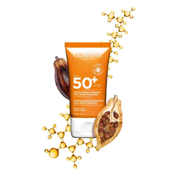 Cette crème solaire visage SPF 50+ de Clarins repose sur un système filtrant mixte (chimique et organique) particulièrement complet : le **Diethylamino Hydroxybenzoyl Hexyl Benzoate (DHHB)**, l’**Ethylhexyl Triazone**, le **Bis-Ethylhexyloxyphenol Methoxyphenyl Triazine (Tinosorb S)** et le **Methylene Bis-Benzotriazolyl Tetramethylbutylphenol (Tinosorb M)** assurent ensemble une protection large spectre UVA/UVB à haute efficacité photostable. L’**Ethylhexyl Salicylate** et le **Butyloctyl Salicylate** complètent la couverture UVB. Sur le plan des actifs complémentaires, l’**huile d’argan** (*Argania Spinosa*) apporte des acides gras essentiels et des tocophérols naturels soutenant la barrière lipidique cutanée ; le **Tocopheryl Acetate** (vitamine E) agit comme antioxydant en neutralisant les radicaux libres induits par les UV ; l’**extrait de cacao** (*Theobroma Cacao*) contribue également à la protection antioxydante ; le **jus d’aloe vera** en poudre et la **glycérine** assurent une hydratation de surface. La texture est stabilisée par des émulsifiants doux (Polyglyceryl-6 Stearate, Potassium Cetyl Phosphate) et des agents rhéologiques (Xanthan Gum, Ammonium Acryloyldimethyltaurate/VP Copolymer). Ce produit convient aux peaux matures ou exposées au vieillissement photo-induit, ainsi qu’aux peaux sèches à normales souhaitant une protection solaire quotidienne du visage avec un soutien antioxydant.