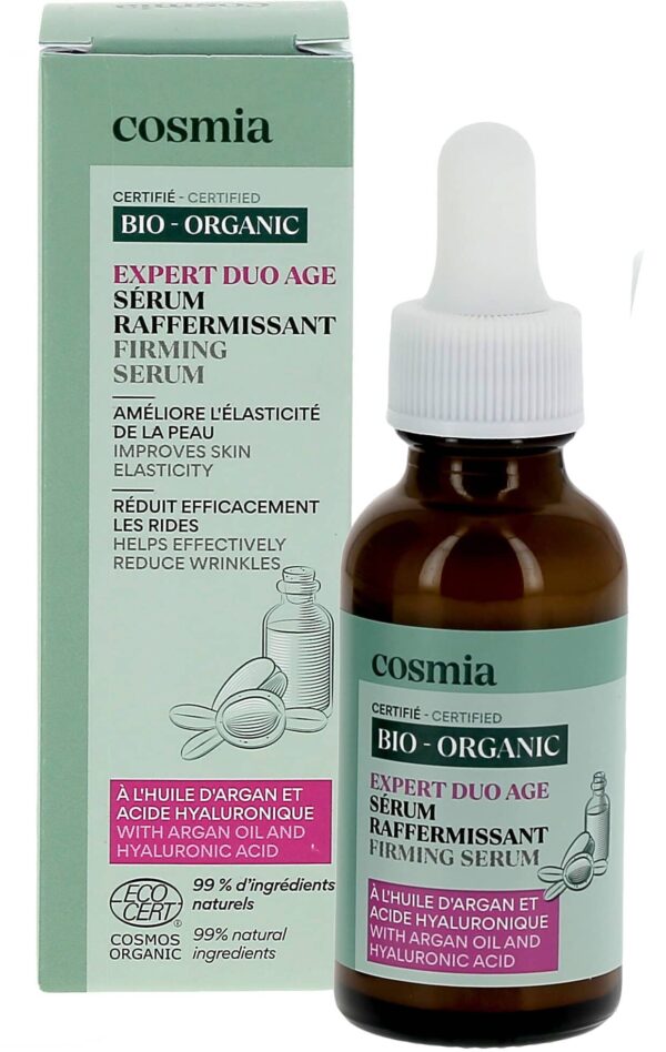 Le CosmiaExpert Duo Age Sérum Raffermissant s’adresse principalement aux peaux présentant des signes de relâchement, de perte de fermeté et de premières rides. Selon mon analyse, ce sérum de la marque CosmiaExpert vise à raffermir la peau, améliorer son élasticité et apporter une hydratation intense. Sa formulation, orientée vers la prévention et la correction des signes de l’âge, en fait un allié pour les peaux matures ou en perte de tonicité, mais il peut également convenir en prévention dès l’apparition des premiers signes de vieillissement cutané.