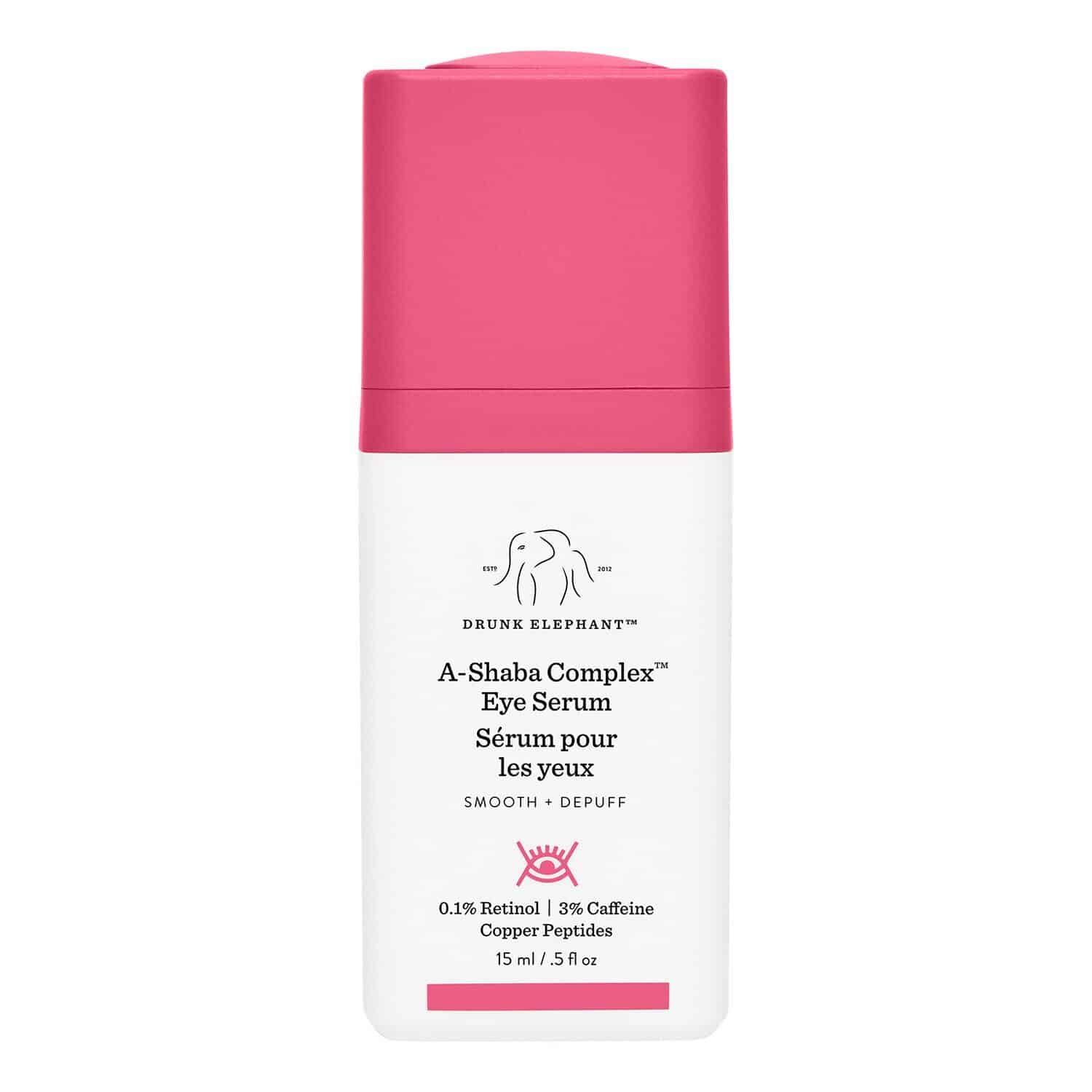 Le A-Shaba Complex Eye Serum de Drunk Elephant est un soin contour des yeux formulé autour d’une combinaison dense de peptides bioactifs et d’actifs ciblant les principales problématiques de la zone péri-orbitaire. La caféine et le dipeptide-2 agissent en synergie pour favoriser la microcirculation et réduire la stase veineuse, contribuant à atténuer les cernes et les poches. Les peptides de cuivre (BIS(Tripeptide-1) Copper Acetate, Copper Lysinate/Prolinate) stimulent la synthèse du collagène et participent au remodelage de la matrice extracellulaire, tandis que le Palmitoyl Tripeptide-1 et le Palmitoyl Tetrapeptide-7 agissent sur les voies de signalisation impliquées dans la fermeté cutanée. La N-hydroxysuccinimide et la chrysine ciblent spécifiquement la dégradation de l’hémoglobine responsable des cernes colorés. Le rétinol, associé à la niacinamide, soutient le renouvellement cellulaire et l’homogénéisation du teint. L’acide alpha-lipoïque (thioctic acid), l’ubiquinone et le tocophérol apportent une protection antioxydante. L’hydratation est assurée par le sodium hyaluronate crosspolymer, le panthénol et les céramides. Ce sérum convient aux peaux présentant des signes visibles de fatigue, de vieillissement cutané ou d’hyperpigmentation au niveau du contour des yeux, y compris les peaux sensibles, grâce à l’absence de parfum et d’huiles essentielles irritantes.