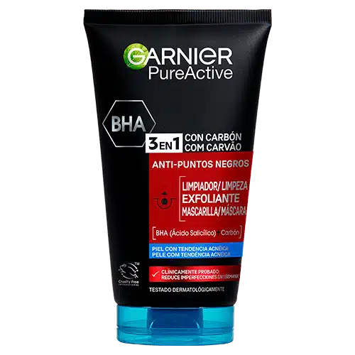AQUA, KAOLIN (Argile), GLYCERIN, ZEA MAYS STARCH, DECYL GLUCOSIDE (Tensioactif non ionique), CI 77499 (Colorant noir – Tétraoxyde de fer), SODIUM LAURETH SULFATE (Tensioactif anionique), PEG-7 GLYCERYL COCOATE, PERLITE (Perlite), PEG-30 DIPOLYHYDROXYSTEARATE, ZINC GLUCONATE (Zinc), TRIDECETH-6, SODIUM HYDROXIDE, PUMICE, CHARCOAL POWDER (Charbon), TETRASODIUM EDTA, CITRIC ACID, XANTHAN GUM, POLYGLYCERIN-10, POLYGLYCERYL-10 MYRISTATE, POLYGLYCERYL-10 STEARATE, ACRYLATES/C10-30 ALKYL ACRYLATE CROSSPOLYMER, SODIUM DEHYDROACETATE, SALICYLIC ACID (Acide salicylique), PHENOXYETHANOL, PARFUM (Parfum) Ce nettoyant 3-en-1 de Garnier SkinActive associe plusieurs actifs à action complémentaire sur les peaux à tendance grasse et acnéique. La **poudre de charbon actif** (Charcoal Powder) agit par adsorption pour capter les impuretés, l’excès de sébum et les résidus de pollution logés dans les pores. Le **kaolin**, argile purifiante, complète cette action en absorbant le sébum de surface. L’**acide salicylique** (BHA), kératolytique, pénètre dans les pores pour dissoudre les bouchons sébacés et favoriser le renouvellement cellulaire, ce qui en fait un actif de choix contre les points noirs et les comédons. La **perlite** et la **ponce** (Pumice) apportent une légère action exfoliante mécanique. Le **gluconate de zinc** contribue à réguler la production de sébum et possède des propriétés apaisantes et antibactériennes légères. La formule intègre également de la **glycérine** pour limiter l’effet desséchant du nettoyage. Ce produit convient principalement aux peaux mixtes à grasses, sujettes aux imperfections et aux pores dilatés. Il est déconseillé aux peaux sèches, sensibles ou réactives en raison de la combinaison d’agents tensioactifs, d’exfoliants mécaniques et d’acide salicylique, qui peut s’avérer irritante.