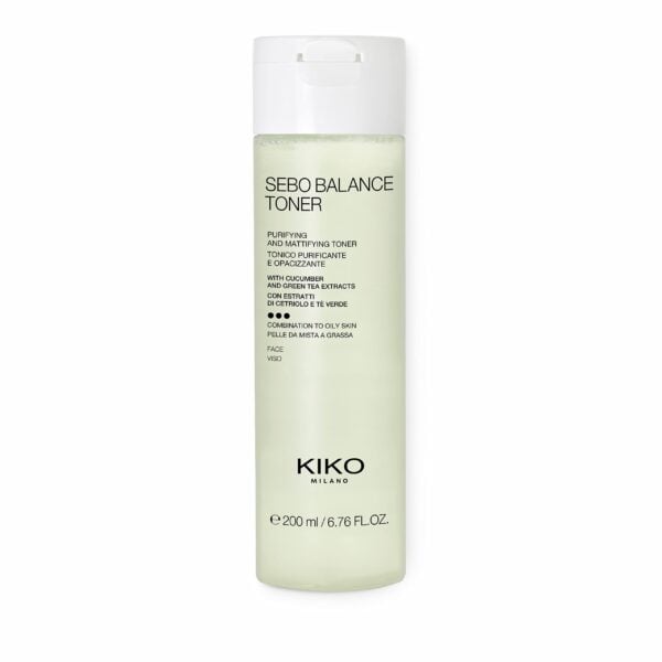 AQUA, BUTYLENE GLYCOL, PROPANEDIOL, SACCHARIDE ISOMERATE, NIACINAMIDE (Vitamine B3), PPG-26-BUTETH-26, PEG-40 HYDROGENATED CASTOR OIL (Tensioactif non ionique), ENANTIA CHLORANTHA BARK EXTRACT, GLYCERIN, FRUCTOSE (Sucre), PARFUM (Parfum), SUCROSE (Sucre), BENZOPHENONE-4 (Benzophenone-4, Filtre UVB, UVA COURT), SALIX ALBA BARK EXTRACT (Saule blanc), XANTHAN GUM, CUCUMIS SATIVUS FRUIT EXTRACT (Concombre), CAMELLIA SINENSIS LEAF EXTRACT (Thé vert), OLEANOLIC ACID, SODIUM CITRATE, LACTIC ACID (Acide exfoliant AHA), CITRIC ACID, PHENOXYETHANOL, ETHYLHEXYLGLYCERIN, BENZYL ALCOHOL (Allergène réglementé), SODIUM BENZOATE, POTASSIUM SORBATE, CI 42090 (Colorant bleu) Le Sebo Balance Toner de Kiko est une lotion purifiante formulée pour les peaux mixtes à grasses. Sa composition repose sur plusieurs actifs fonctionnels bien documentés : la **niacinamide** (vitamine B3), qui régule la production de sébum, resserre l’aspect des pores et homogénéise le teint ; l’**acide oléanoïque**, un triterpène d’origine végétale reconnu pour ses propriétés séborégulatrices en inhibant la 5α-réductase impliquée dans la synthèse des lipides cutanés ; et l’**extrait d’écorce d’Enantia chlorantha**, riche en berbérine, qui contribue également au contrôle du sébum et à l’effet matifiant. Le **Saccharide Isomerate** assure une hydratation ciblée sans alourdir la peau, tandis que les extraits de **saule blanc** (Salix alba, source d’acide salicylique naturel), de **concombre** et de **thé vert** apportent des propriétés apaisantes, légèrement kératolytiques et antioxydantes. L’acidité du produit est ajustée par l’acide lactique et l’acide citrique, favorisant un pH compatible avec le microbiome cutané. Ce toner convient aux peaux mixtes à grasses sujettes aux brillances, aux pores dilatés et aux imperfections légères à modérées.Informations complémentaires