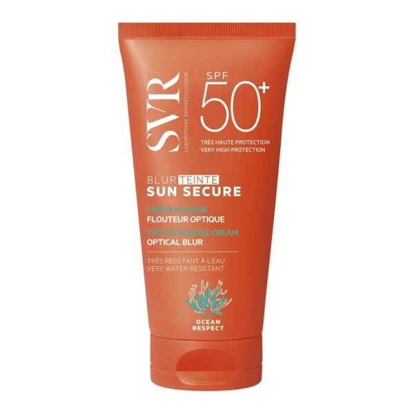 AQUA, SILICA (Silica), ISODODECANE (Huile Minérale), DIETHYLAMINO HYDROXYBENZOYL HEXYL BENZOATE (Uvinul A plus, Filtre UVA COURT, UVA LONG), DICAPRYLYL CARBONATE, ISOPROPYL LAUROYL SARCOSINATE, ETHYLHEXYL TRIAZONE (Uvinul t150, Filtre UVB), BEHENETH-25, DIETHYLHEXYL BUTAMIDO TRIAZONE (Uvasorb HEB, Filtre UVB, UVA COURT), BIS-ETHYLHEXYLOXYPHENOL METHOXYPHENYL TRIAZINE (Tinosorb S, Filtre UVB, UVA COURT, UVA LONG), COCO-CAPRYLATE/CAPRATE, CI 77891 (Colorant blanc: Dioxyde de titane), DIMETHICONE/BIS-ISOBUTYL PPG-20 CROSSPOLYMER, PENTYLENE GLYCOL, CETEARYL ALCOHOL, 1,2-HEXANEDIOL, NIACINAMIDE (Vitamine B3), COCO-GLUCOSIDE (Tensioactif non ionique), SODIUM POLYACRYLATE STARCH, ETHYLHEXYLGLYCERIN, CAPRYLYL GLYCOL, CI 77492 (Colorant jaune, Oxyde de fer), GLYCERIN, PARFUM (Parfum), CI 77491 (Colorant rouge, Trioxyde de Fer), TOCOPHEROL (Vitamine E), TRIETHOXYCAPRYLYLSILANE (Silicone), CI 77499 (Colorant noir – Tétraoxyde de fer), GLYCINE SOJA OIL (Huile végétale de Soja), LECITHIN, LEPIDIUM SATIVUM SPROUT EXTRACT (Cresson alénois) Le Blur Sun Secure SPF 50+ teinté de SVR est une protection solaire teintée formulée autour d’une combinaison de filtres UV organiques à large spectre : le diéthylamino hydroxybenzoyl hexyl benzoate et l’éthylhexyl triazone (filtres UVA/UVB), le diéthylhexyl butamido triazone et le bis-éthylhexyloxyphénol méthoxyphényl triazine (Tinosorb S), ce dernier offrant une couverture étendue sur l’ensemble du spectre UV. La texture est structurée par une silice sphérique et un crosspolymère siliconé (diméthicone/bis-isobutyl PPG-20 crosspolymer), qui confèrent un effet floutant optique et une sensation mate en réduisant la visibilité des pores et irrégularités de surface. La niacinamide (vitamine B3) agit sur l’homogénéité du teint et le confort cutané, tandis que le tocophérol (vitamine E) apporte une protection antioxydante complémentaire. L’extrait de cresson alénois (*Lepidium sativum* sprout extract) est associé à des propriétés anti-âge légères. Les pigments minéraux (CI 77891, 77491, 77492, 77499) assurent une couverture naturelle adaptable. Ce produit convient aux peaux mixtes à grasses souhaitant une protection solaire quotidienne avec un effet perfecteur de teint, ainsi qu’aux peaux sensibles sujettes aux taches ou à l’éclat irrégulier.