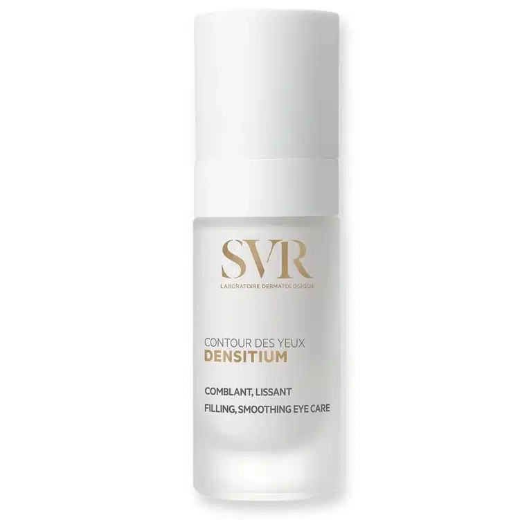Le Densitium Contour des Yeux de Laboratoire SVR est une crème ciblant les signes de vieillissement spécifiques à la zone péri-orbitaire, notamment la perte de fermeté, les poches et les cernes. Sa formule associe plusieurs actifs fonctionnels : l’acide hyaluronique assure une hydratation par effet hygroscopique et contribue au maintien du volume cutané superficiel ; le palmitoyl tétrapeptide-7, peptide de synthèse, module la production de cytokines pro-inflammatoires et stimule la synthèse de composants matriciels comme le collagène ; la chrysine, flavonoïde d’origine végétale, agit sur la dégradation de la bilirubine responsable des cernes colorés, en potentialisant l’activité des UDP-glucuronosyltransférases ; l’extrait de Lycium barbarum (baie de goji) apporte des polyphénols antioxydants protégeant les cellules du stress oxydatif ; le ferment de Lactobacillus contribue au renforcement de la barrière cutanée ; enfin, l’extrait de romarin complète l’action antioxydante. La base émolliente à base de triglycérides caprylique/caprique et d’huile végétale (Olus Oil) assure confort et tolérance. Ce produit convient aux peaux matures ou présentant des signes précoces de relâchement péri-orbitaire, ainsi qu’aux peaux sujettes aux cernes vasculaires ou aux poches. Sa formulation sans alcool et avec des conservateurs doux (sodium benzoate, potassium sorbate) la rend adaptée aux peaux sensibles.