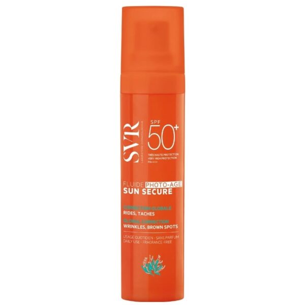 Le Sun Secure Fluide Photo-Age SPF 50+ de SVR est une protection solaire à spectre large formulée autour d’un système filtrant exclusivement chimique combinant quatre filtres UV : le Diethylamino Hydroxybenzoyl Hexyl Benzoate et le Bis-Ethylhexyloxyphenol Methoxyphenyl Triazine (Tinosorb S) pour la couverture UVA, l’Ethylhexyl Triazone et le Diethylhexyl Butamido Triazone pour les UVB. Cette association assure une protection SPF 50+ photostable. La formule intègre également des actifs à visée anti-âge et réparatrice : la niacinamide (vitamine B3) agit sur l’homogénéité du teint, la régulation du sébum et le renforcement de la barrière cutanée ; le sodium acetylated hyaluronate, forme acétylée de l’acide hyaluronique, assure une hydratation durable en surface ; l’extrait de Cucumis Melo (melon) apporte des enzymes antioxydantes (superoxyde dismutase) ; l’extrait de Lepidium Sativum (cresson) soutient la résistance cellulaire au stress oxydatif ; le tocophérol (vitamine E) complète la protection antioxydante. La texture fluide, non grasse, à base de Dicaprylyl Carbonate et Coco-Caprylate/Caprate, convient particulièrement aux peaux mixtes à grasses, aux peaux exposées au soleil de façon régulière et aux peaux présentant des signes de photovieillissement (taches, perte de fermeté). Elle est adaptée à une utilisation quotidienne au visage.