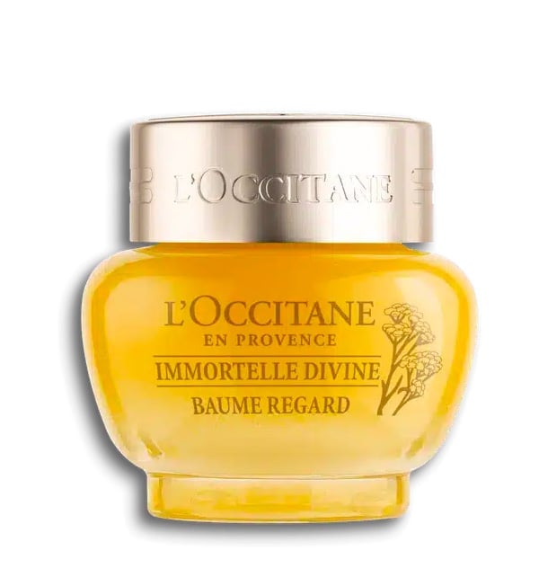 Le Baume Yeux Divin Immortelle de L’Occitane en Provence est une formule riche destinée au soin du contour des yeux, particulièrement adaptée aux peaux matures ou présentant des signes visibles de vieillissement cutané (rides, ridules, perte de fermeté, cernes). Son actif phare est l’extrait et l’huile essentielle d’*Helichrysum italicum* (immortelle), reconnus pour leurs propriétés antioxydantes et leur capacité à soutenir le renouvellement cellulaire. La formule intègre plusieurs huiles riches en acides gras essentiels : l’huile de bourrache (*Borago officinalis*) et d’échium (*Echium plantagineum*), sources d’acide gamma-linolénique et d’acide stéaridonique, qui renforcent la barrière cutanée et limitent la perte en eau transépidermique. Le beurre de karité (*Butyrospermum parkii*) et l’huile de caméline apportent une action nourrissante et protectrice. L’acide hyaluronique assure une hydratation de surface, tandis que l’adénosine agit sur la souplesse et contribue à atténuer les rides d’expression. L’escine, issue du marron d’Inde, cible la microcirculation locale et peut aider à réduire l’aspect des cernes vasculaires et des poches. La texture baume convient davantage aux peaux sèches à très sèches ; les peaux mixtes ou sensibles à la chaleur devront l’utiliser avec modération.