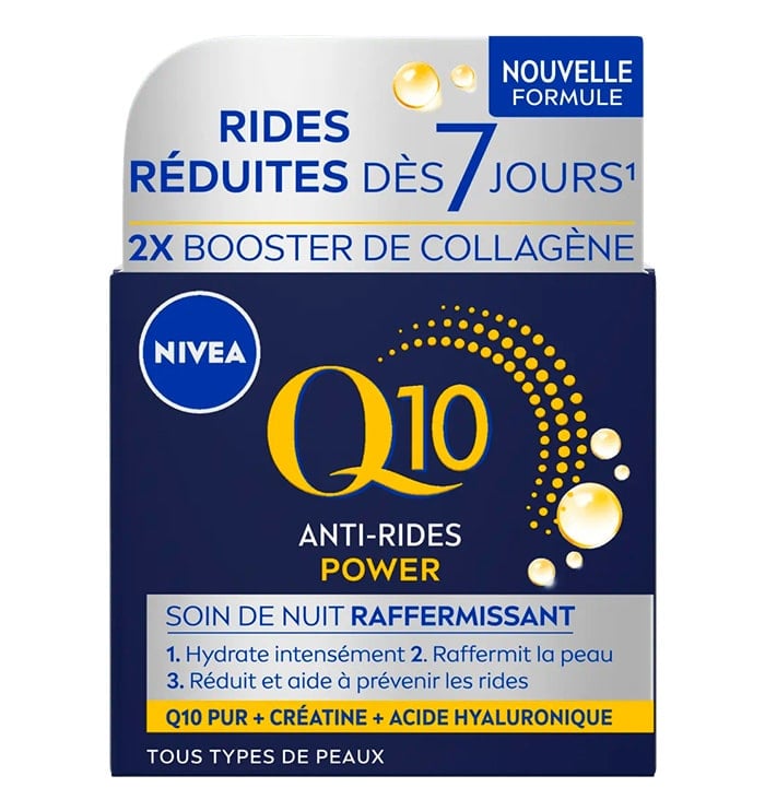 Le Soin Visage de Nuit Raffermissant Q10 Anti-Rides de Nivea s’adresse principalement aux peaux présentant des signes de relâchement cutané, de perte de fermeté et de rides installées ou naissantes. Ce soin de nuit cible le vieillissement cutané, en particulier la diminution de la tonicité et l’apparition des rides, grâce à une formulation pensée pour soutenir la régénération nocturne de la peau. Mon avis d’expert est que la marque propose ici une approche complète, combinant hydratation, nutrition et stimulation cellulaire, adaptée aux peaux matures ou en prévention du vieillissement.