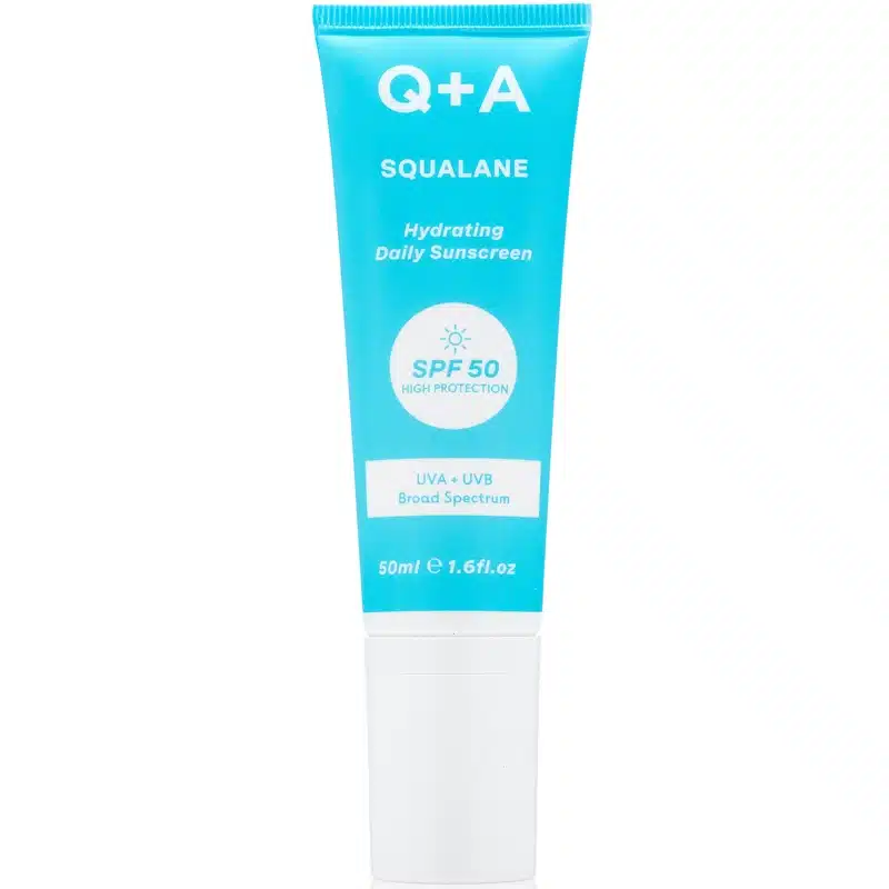 Ce soin solaire quotidien de la marque Q+A associe une protection SPF 50 à une formulation hydratante, reposant sur une combinaison de filtres minéraux et chimiques. Le **dioxyde de titane** (TiO₂) agit comme filtre physique en réfléchissant les rayons UV, tandis que le **diéthylamino hydroxybenzoyl hexyl benzoate**, l’**éthylhexyl triazone** et le **bis-éthylhexyloxyphénol méthoxyphényl triazine** complètent la protection par absorption chimique des UVA et UVB. Le **squalane**, d’origine végétale, assure une hydratation légère sans effet occlusif, renforcé par la **glycérine** et la **bétaïne**, agents humectants classiques. L’**allantoïne** contribue à l’apaisement cutané, tandis que le **tocophérol** (vitamine E) et l’**extrait de Camellia sinensis** apportent une activité antioxydante contre le stress oxydatif induit par les UV. Les huiles de **sésame**, de **meadowfoam** (*Limnanthes alba*) et de **tournesol**, ainsi que les **esters de jojoba**, enrichissent la texture en acides gras nourrissants. Ce produit convient particulièrement aux peaux normales à sèches nécessitant une protection solaire quotidienne avec un apport hydratant, et peut également intéresser les peaux sensibles grâce à la présence d’actifs apaisants. Son format 50 ml en fait un soin adapté à un usage facial régulier.