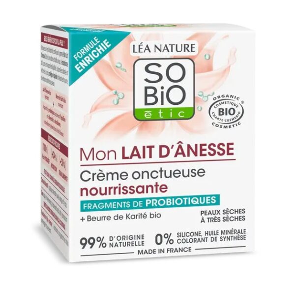 La Crème onctueuse nourrissante Mon lait d’Ânesse de So’Bio Étic s’adresse principalement aux peaux sèches, sensibles ou en manque de confort. Sa formulation vise à restaurer la barrière cutanée, apaiser les irritations et offrir une hydratation durable. Mon analyse met en avant une texture riche, idéale pour les peaux fragilisées par les agressions extérieures ou sujettes à la déshydratation. La marque So’Bio Étic propose ici une approche naturelle, respectueuse de l’épiderme, avec une attention particulière portée à la tolérance et à la douceur.