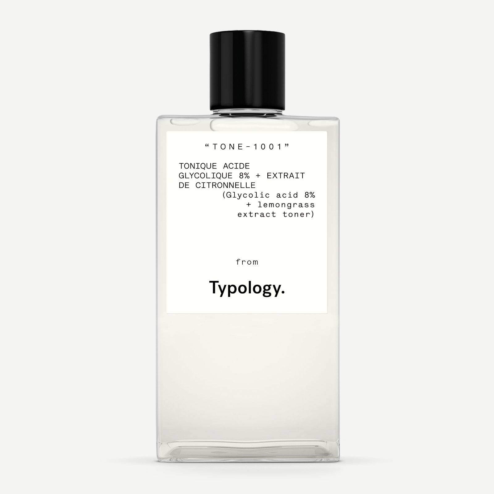 AQUA, GLYCOLIC ACID (Acide exfoliant AHA), CYMBOPOGON SCHOENANTHUS WATER, SODIUM HYDROXIDE, 1,2-HEXANEDIOL, ERYTHRITOL, GLYCERIN, BENZYL ALCOHOL (Allergène réglementé), DEHYDROACETIC ACID, CITRIC ACID, POTASSIUM SORBATE, SODIUM BENZOATE, CITRAL (Allergène réglementé) Ce tonique exfoliant de Typology associe l’acide glycolique à 8 %, un alpha-hydroxyacide (AHA) d’origine naturelle, à un extrait aqueux de citronnelle (*Cymbopogon schoenanthus*). L’acide glycolique agit par dissolution des liaisons intercellulaires de la couche cornée, favorisant le renouvellement cellulaire, affinant le grain de peau et améliorant progressivement l’éclat et l’homogénéité du teint. L’eau florale de citronnelle apporte des propriétés purifiantes et légèrement astringentes, tandis que la glycérine et l’érythritol contribuent à maintenir l’hydratation cutanée, limitant l’effet desséchant potentiel des AHA. La conservation est assurée par une combinaison d’agents (alcool benzylique, acide déhydroacétique, sorbate de potassium, benzoate de sodium). Ce produit convient aux peaux ternes, irrégulières ou à tendance acnéique souhaitant intégrer une exfoliation chimique douce dans leur routine. Il est déconseillé aux peaux très sensibles ou réactives, et une protection solaire quotidienne est indispensable lors de son utilisation, les AHA augmentant la photosensibilité cutanée.Informations complémentaires