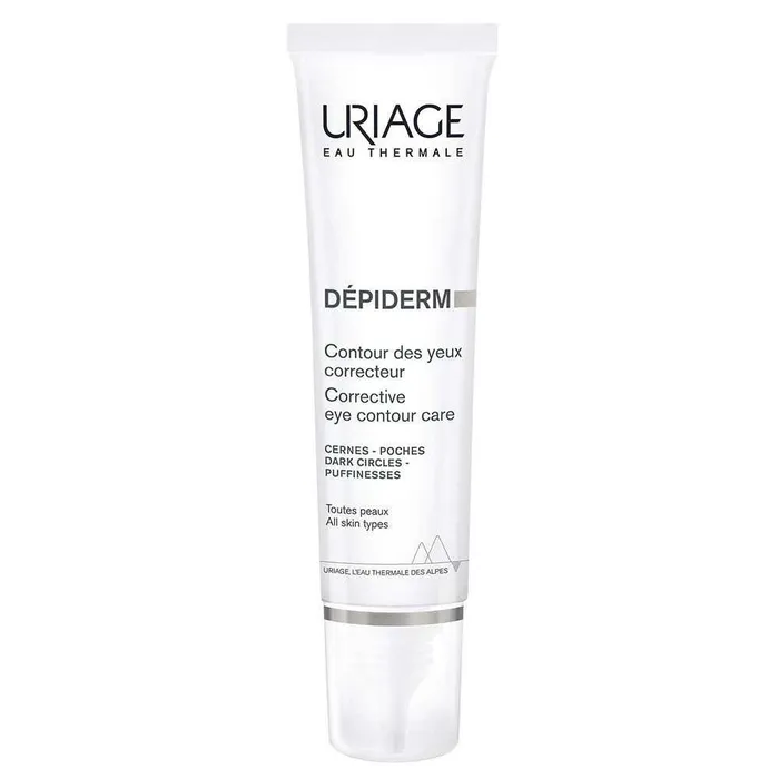 Le Dépiderm Contour des Yeux Correcteur d’Uriage est une formule ciblant les problématiques de pigmentation et de fatigue de la zone péri-orbitaire. L’**ascorbyl glucoside**, forme stable de la vitamine C, inhibe la synthèse de mélanine en bloquant l’activité de la tyrosinase, contribuant à atténuer les cernes pigmentaires et les taches. La **niacinamide** (vitamine B3) agit en complément en réduisant le transfert des mélanosomes vers les kératinocytes, tout en renforçant la barrière cutanée et en diminuant les rougeurs. Le **dipotassium glycyrrhizate**, dérivé de la réglisse, apporte une action anti-inflammatoire et dépigmentante douce. L’**extrait de Pisum sativum** (pois) cible la microcirculation locale pour atténuer les cernes vasculaires. Le **sodium dextran sulfate** soutient la tonicité vasculaire. La **biosaccharide gum-1** assure un effet filmogène et apaisant, tandis que le **squalane** et le **tocophéryl acétate** (vitamine E) apportent hydratation et protection antioxydante. La présence de **mica** et de **CI 77891** (dioxyde de titane) confère un effet optique correcteur immédiat. Ce soin convient aux peaux présentant des cernes mixtes (pigmentaires et vasculaires), des irrégularités de teint et des signes de fatigue autour des yeux, y compris les peaux sensibles.
